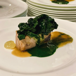 – Filetto di maiale arrostito con cavolo verza stufato, crema di mele e olio evo